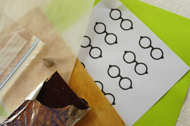 11. Imprima unas gafas muy redondas (al igual que Harry) en un pedazo de papel y cubrirlo con una hoja de papel de prueba de grasa. Derretir 50g de chocolate negro y colóquela en una bolsa de zip con una punta de N ° 1 (o un rincón muy pequeño recortado y reforzado con alguna cinta). Trazar el contorno de los vasos con el chocolate. Dejó la caída de chocolate de aproximadamente 0,5 cm de altura para que obtenga una línea suave y probar y aplique una presión constante en la bolsa a la hebra de chocolate siempre tiene el mismo grosor.