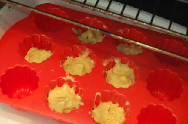 - Precalentar el horno a 180C / 160C ventilador/350F/Gas 4 y colocar 12 casos en la lata si se utiliza. Usé una bandeja de pastel mini de silicona que se puede ver en las siguientes imágenes. En las fotos había hecho sólo una pequeña cantidad de la mezcla para que no llene la bandeja entera.