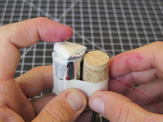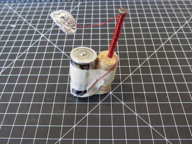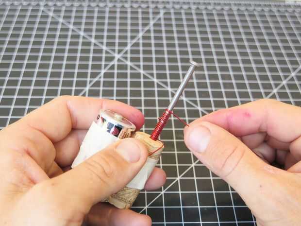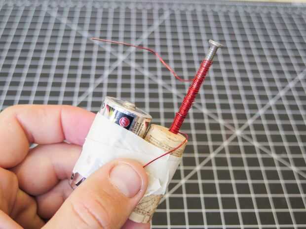 Hacer una papel sandwich todo el extremo alrededor de un alambre y cinta adhesiva permanentemente en la parte inferior de la batería. Proceder a envolver el resto del alambre alrededor de la uña, dejando un par libre como un interruptor. Mush alguna hoja más en el otro extremo y deje sin adjunto en y puede apagar su electroimán.