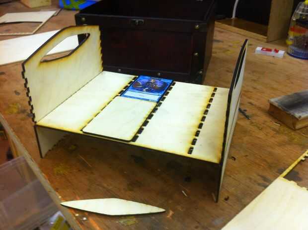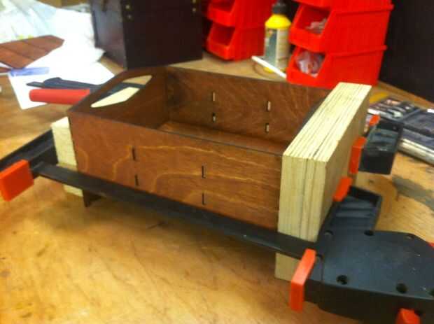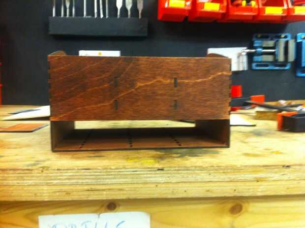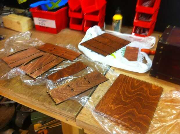 Después tuve mis planes listos llevó al Hackspace y ponerlos a través del cortador del laser. Usé 3mm contrachapado de abedul de A4 para la bandeja ya que era la única madera que tenían en mano. Salió sorprendentemente bien después de un buen lijado y una capa de tinte y cera.