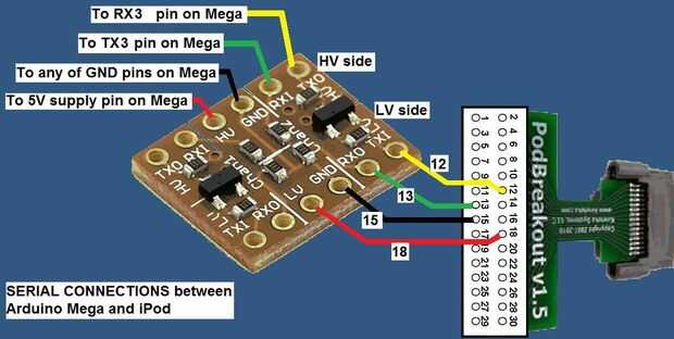 Esta parte aborda cómo el Arduino habla con el iPod con conexión serial. Observe cómo el convertidor de voltaje se ha utilizado para mantener el lado de Arduino en el lado de iPod a 3,3 v y 5V