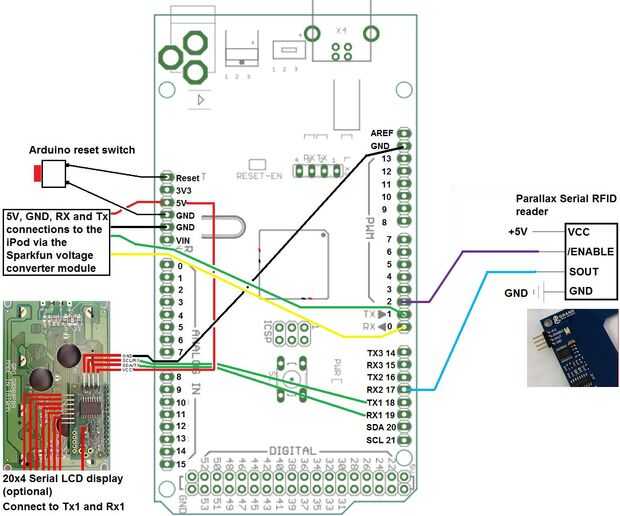 (Los cables de + 5 v y GND entre Arduino y el lector de RFID no se muestran en el diagrama).