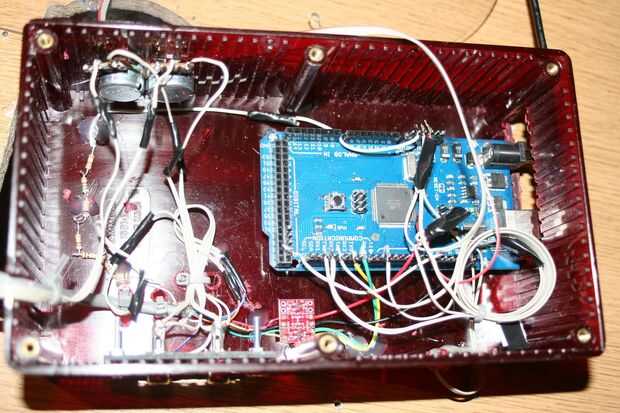 Arriba a la izquierda son dos potenciómetros de 10K Ohm. Estos ajustan el volumen a los auriculares (uno para cada canal).