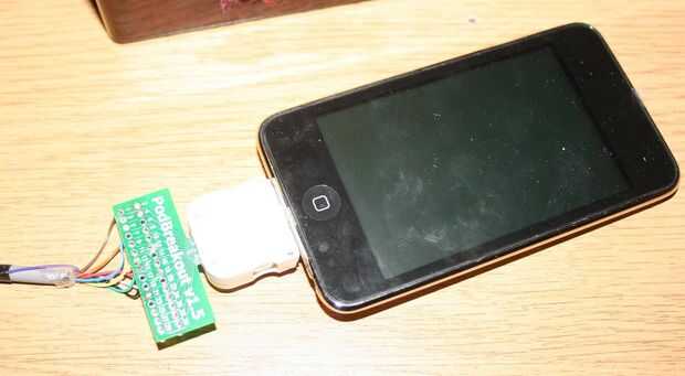 Esto demuestra la PodGizmo breakout junta con cables soldados a él y enchufado en el iPod.