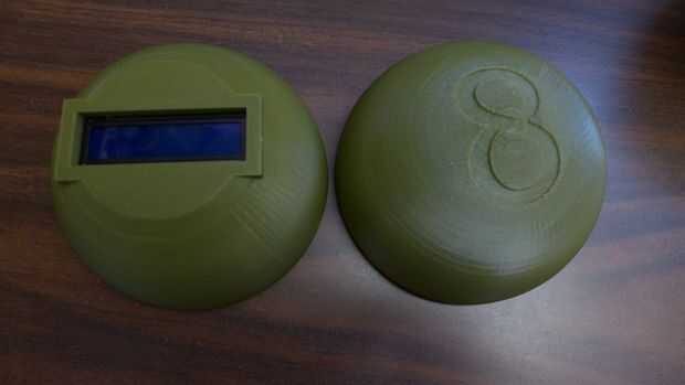 Que desea imprimir la parte inferior del eightball primero para comprobar y ver si su pantalla se coloque dentro del agujero. Mi recomendación es iniciar una impresión y luego detenerlo después de que ha impreso aproximadamente 3/8"(10mm) y compruebe si la abertura adapta a su pantalla LCD. La apertura final de mi parte es 2,815 "x 0,939" (71.6 mm x 23.9 mm). Imprimí mis partes usando un Makerbot Replicator 2 y ligeramente más extrusiones. También he incluido los archivos de Autodesk Inventor, si necesita realizar cambios.
