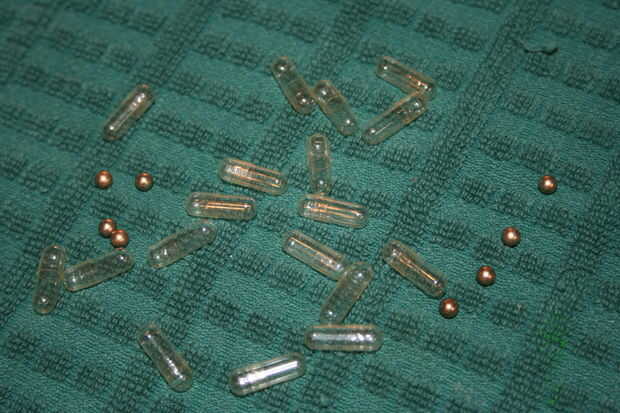 ingredientes:-30 pulgadas de cordones de gimp de rayón pintados a mano, corte en pulgadas de 6-5 piezas-2 pequeños pétalos grano tapas-12 granos de Elaine Ray Magic Bean-2 cuadrados de anillas, 1/4 pulgada-8 pulgadas de alambre, calibre 20, corte en