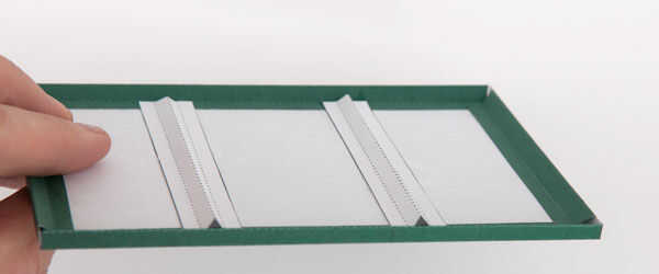 Unir la base doblando las aletas a los lados para hacer tubos de ángulo recto del triángulo. Pegar los dos rigidizadores en lugar a través del la parte posterior de la base.