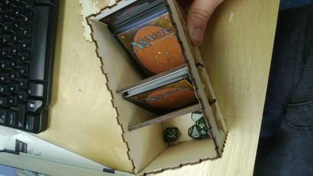 esto es una caja cubierta con secciones separadas para dados, cubierta y cubierta lateral. El archivo para hacer esto en el cortador del laser están incluido y son fácilmente editable para que usted puede poner su propio diseño en ellos. Que tenga a la arena los divisores y ranuras para conseguir que encajan perfectamente. He utilizado el láser de 45 vatios en la tienda de tecnología para hacer esto tengo mi madera en la tienda de tecnología también.