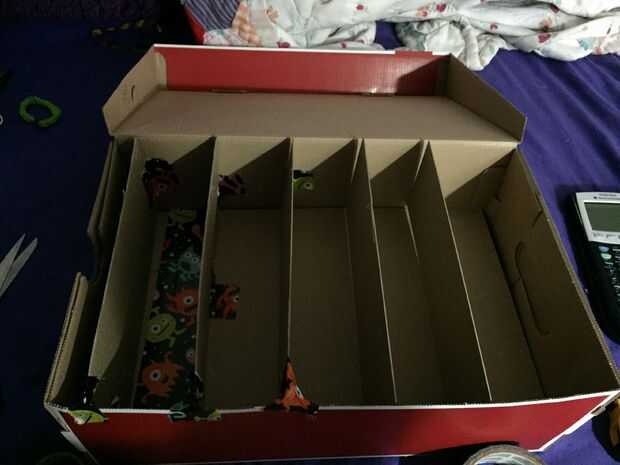Corte los separadores basados en el tamaño de la caja de zapatos. Con cinta adhesiva en. Compruebe cómo las tarjetas caben con una pila de ellos.