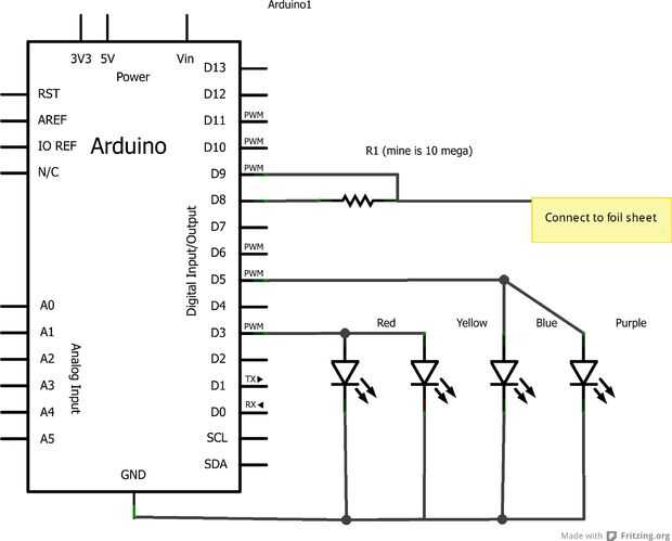 * set up: pin 8 > alta resistencia > un cable a la hoja, uno al pin 9