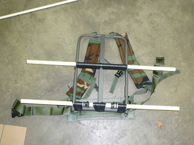 Os adjunto dos pedazos de CPVC de 3/4" a la estructura de paquete para actuar como puntos de enganche. En uno he utilizado unas abrazaderas de plástico y cinta aislante, el otro sólo se ata con cinta aislante. No suena como sería fuerte, pero hace maravillas (y es barato si usted compra un paquete de 10 de las cosas baratas)