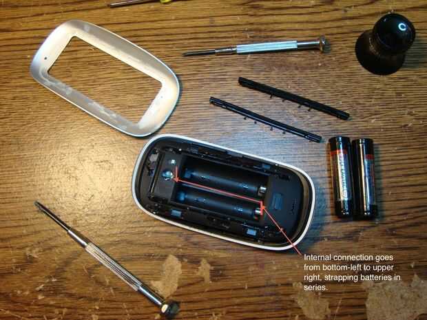 El MM utiliza 3 voltios por cercar sus AAs en serie - con una conexión de batería izquierda negativa (inferior izquierda contacto) a batería derecho positivo (contacto superior derecha) visto desde la parte inferior. Usted debe confirmar esto con tu multímetro en ohms de la configuración - debe ser en o cerca de 0 ohmios.