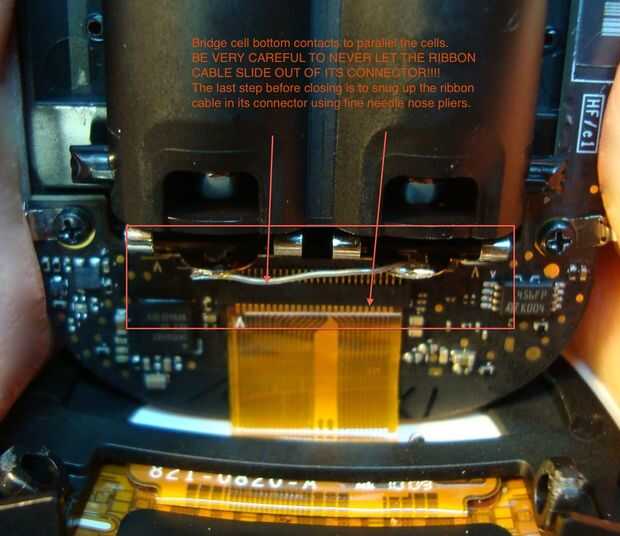 - -Soldadura / soltar el lado izquierdo (como se ve desde la parte superior) de la batería positivo de la batería terminal del borde exterior del PCB, su punto de conexión único.