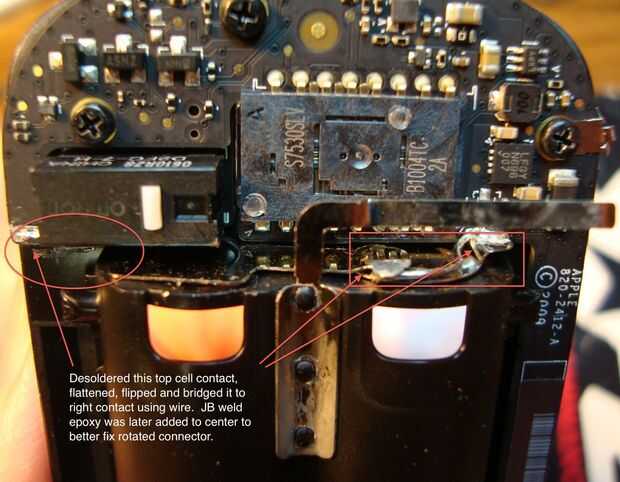 Utilizar epoxi/JB weld para asegurar la nueva terminal de la parte superior, positivo, (pegamento) para volver a unir la parte metálica de la parte inferior del ratón y para garantizar los planeadores plásticos 2 a cada lado del compartimento de pilas. Los planeadores tienen pines que corte las puntas de para volver a insertar. Este es un paso importante y delicado - asegurar la brecha alrededor del ratón y parte inferior es bastante uniforme, que el ratón gira correctamente (izquierda - y trabajo de Prensas del botón derecho del ratón), y que los planeadores insertaron tal que ratón se encuentra tan plano como sea posible sobre una superficie plana. Envuelven ratón en cinta adhesiva para un par de horas para epoxi curar.