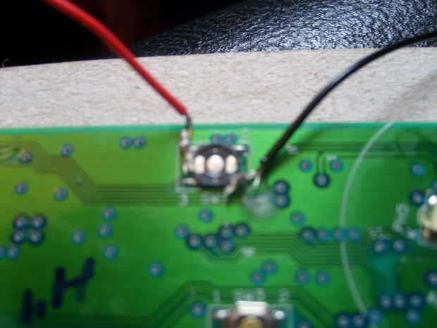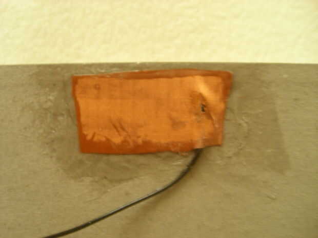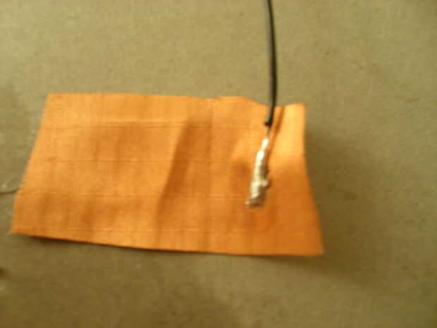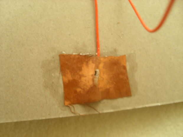 En primer lugar, corta dos pequeños pedazos de tela conductora y soldar un cable a cada uno. Se mueven rápidamente, la tela es relativamente fácil de soldar al pero quemar a través de la rápida. Pegamento de estos parches, soldadura hacia abajo de la cartulina y la escritura de la superficie (ver fotos de ubicación).