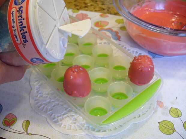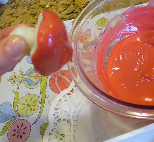 3) retirar las trufas frías del congelador, sostener por el tallo recubierto de caramelo blanco y sumergir las tapas en el caramelo derretido color rojo. Conjunto que las trufas del tallo abajo nuevamente dentro de la bandeja del cubo de hielo vacía.