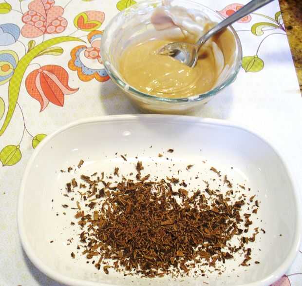 2) para las escamas de chocolate, quitar el borde de una barra de chocolate con el borde de un pelador de verduras en un plato pequeño.
