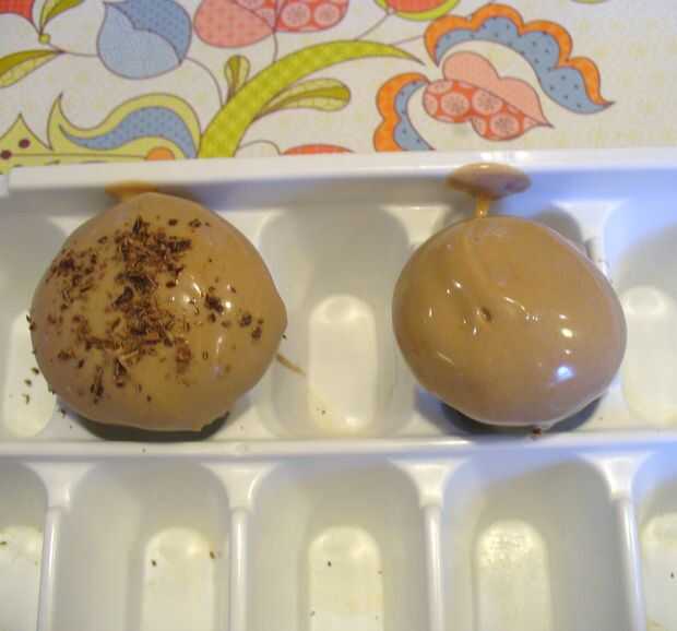 3) Quite las trufas frías del congelador, sostener por el tallo recubierto de caramelo blanco y sumergir las tapas en el caramelo derretido color vainilla/cacao. Conjunto que las trufas del tallo abajo nuevamente dentro de la bandeja del cubo de hielo vacía.