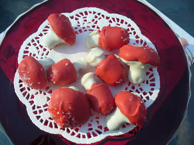 4) espolvorear inmediatamente con los copos de chocolate mientras que las tapas están todavía mojadas. (Una vez los conjuntos de caramelo derretido, el azúcar no se pegue a las copas de los hongos.)