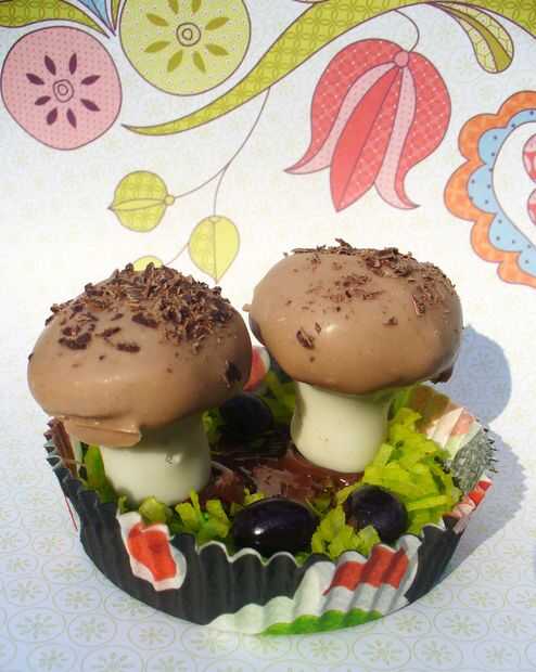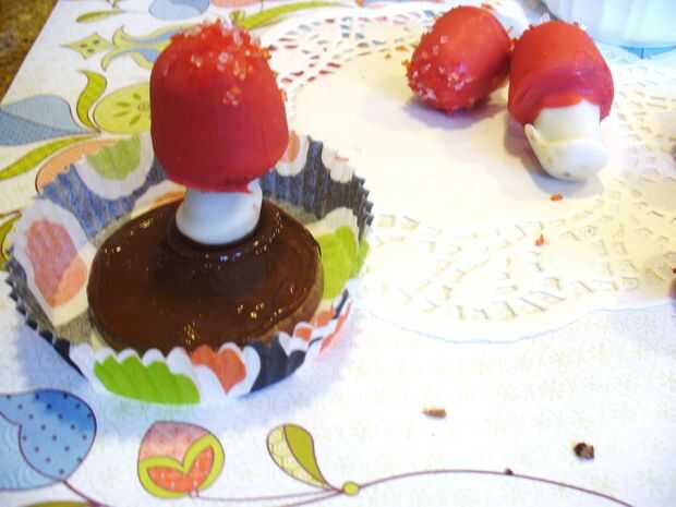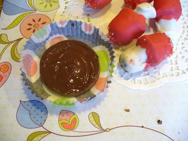 5) sumergir la punta de abajo de un tallo de hongo cubierto caramelo enfriado en el chocolate derretido y pulse la seta en la arcilla derretida caramelo cubierto chocolate base. Mantenerlo constantemente durante unos segundos hasta que se sienta segura en su propio.