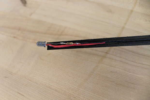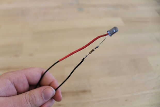 El cable de medición en los pines correctos de soldadura y soldadura su resistencia 100Ω en el extremo de uno de los pedazos de alambre de aforo. Soldadura cathode(+) en la resistencia y la anode(-) en el otro trozo de cable de medición. Es una buena idea incluir tubería del encogimiento del calor en el ánodo para que accidentalmente no toquen los dos terminales del LED.