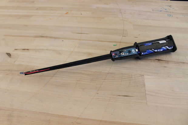Para preparar la soldadura en el infrarrojo led, tienes que cortar dos piezas largas de alambre calibra cada tramo desde el extremo del mando a distancia a sus correspondientes pines. Al soldar el LED infrarrojo, queremos como poco espacio entre el LED y el extremo del mando a distancia como sea posible. Si haces esto correctamente, el LED debe estar centrado con el orificio en el extremo del Magic Wand TV remoto cuando pegar todas las piezas.