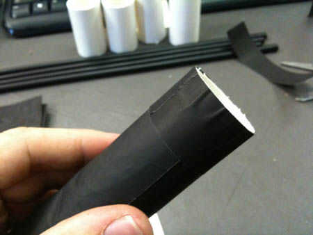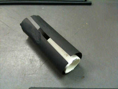 Cortar unos cuadrados de plástico negro, estos deben ser lo suficientemente ancho para pasar alrededor de la tubería de pvc y dos veces la longitud de la tubería. Una vez que han cortado estos abrigo de la pipa redonda y asegúrelo con una banda de cinta negra bordada. Debe haber un buen 10mm del tubo de PVC en la parte superior de la bordada negra pegar para no pegar sobre el borde de la tubería o las flores le falta.