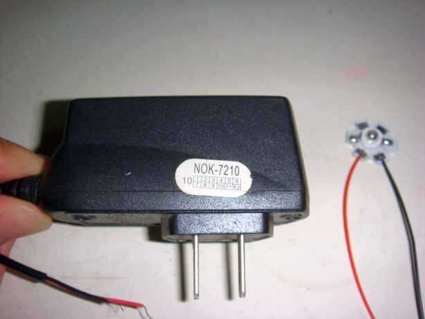 El cargador del teléfono móvil fue para un viejo celular Nokia que ya no utilizo. La salida fue 5.7V 800mA, era en realidad un poco demasiado alto para este "chip de LED de alta potencia", pero sin embargo, fue útil para mí. Si no quieres destruir un cargador de teléfono móvil, apilar juntos 2 pilas AA puede funcionar también. También he utilizado un clip posterior plegable para fijar el cable, pero no es necesario.