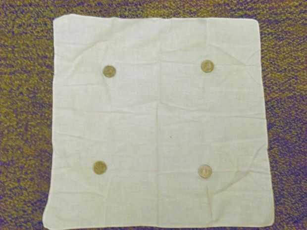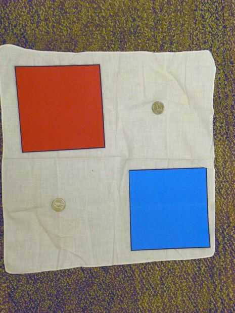 Instalación: Colocar pañuelo con los cuatro cuartos colocados como se muestra. Luego colocar las tarjetas sobre la parte superior izquierda e inferior derecha esquinas.