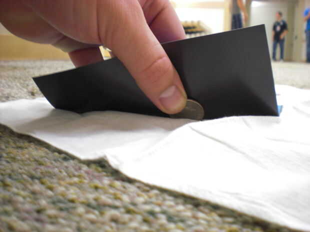 Interruptor de la posición de las dos cartas y la espalda mostrando los cuartos debajo. Cambiar tarjetas de nuevo mientras recoger y ocultar el barrio en la esquina inferior derecha debajo de la tarjeta de índice y colocarlo en la esquina superior izquierda. * Nota: acción realiza rápidamente para tomar el cuarto.