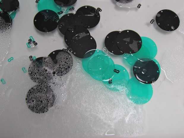 Una vez que las piezas eran corte y pegajoso que tiraron flojos, me los lavé con agua y jabón para quitar el residuo blanco en la parte de la superficie. Me froté los discos con un paño suave (polipropileno arañazos fácilmente) y dejar secar.