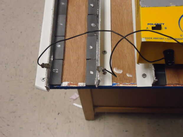 Los carriles de la pista se cubren con cinta de aluminio para hacerlas más conductora. En la tercera imagen vemos cómo conectar una fuente de DC variable a los rieles. Los cables de los motores en los coches deben tocar los rieles con el fin de obtener electricidad para funcionar.