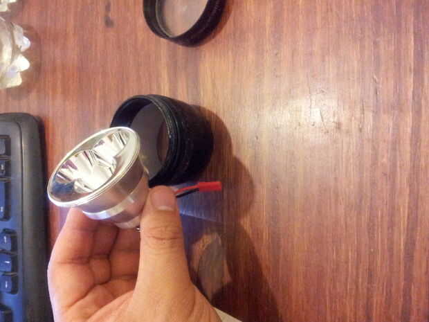 después de limpiar la parte del reflector tiene el reflector capaz de tener en él 52 mm de diámetro para que pueda tener el interior bastante fuerte y la lámpara grande el led se adapta perfectamente al reflector, soldadura dos hilos de la llevó el círculo interno es el (+) y el externo es la (-)