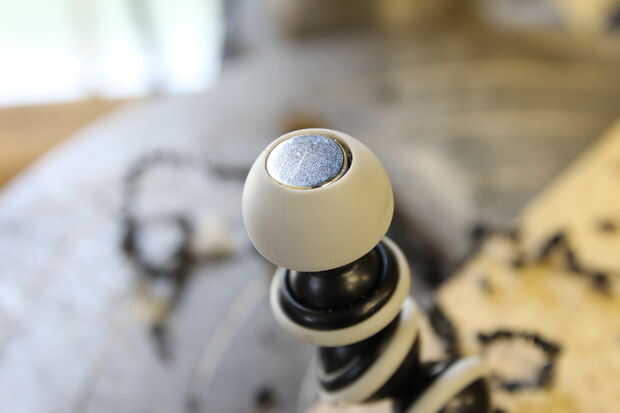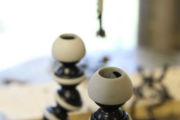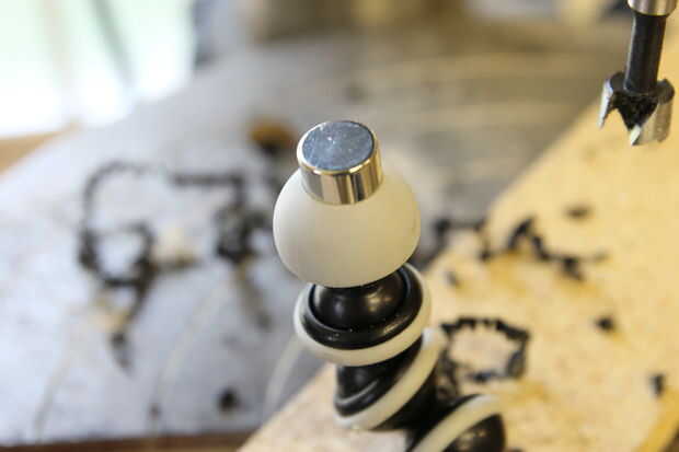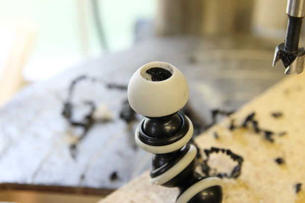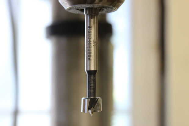 Usando una broca de 1/2 forstner, perforé en los pies por lo que sólo cubría la parte superior de la broca (la broca era de 3/8" de alto). Yo quería los agujeros perfectamente centrado en los pies, pero mi improvisado de la abrazadera no realmente me permitió hacerlo. Terminó siendo bien y mira bien, pero supongo que habría parecía más agradable había que pasé el tiempo para hacer una pinza más elaborada para sostener los pies perfectamente centrados.
