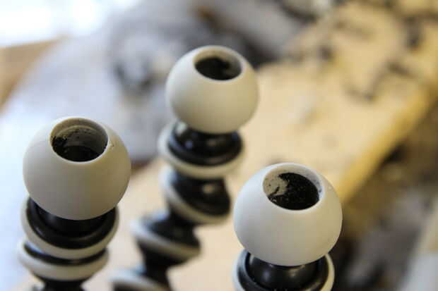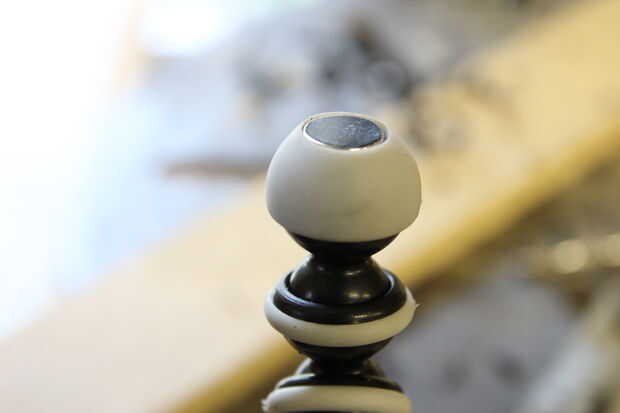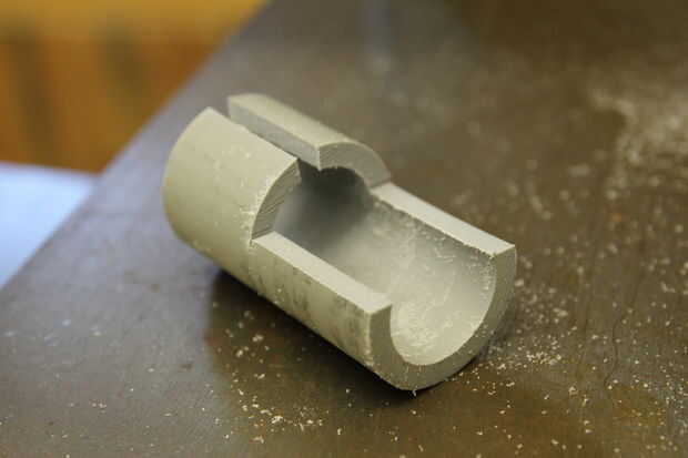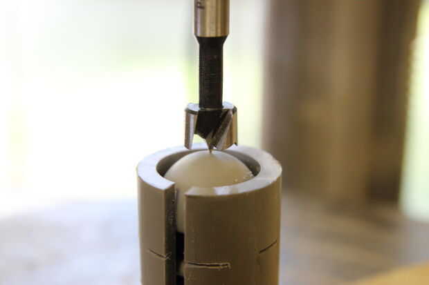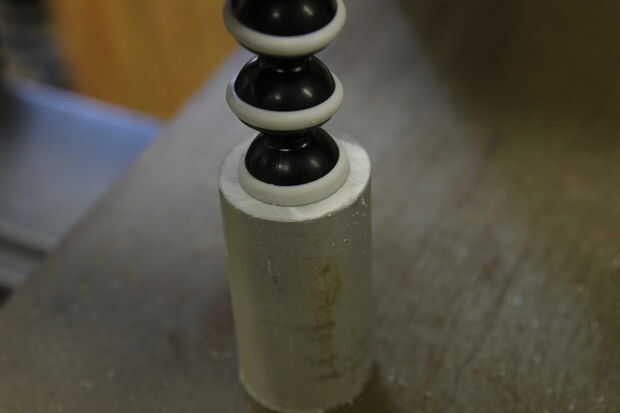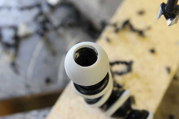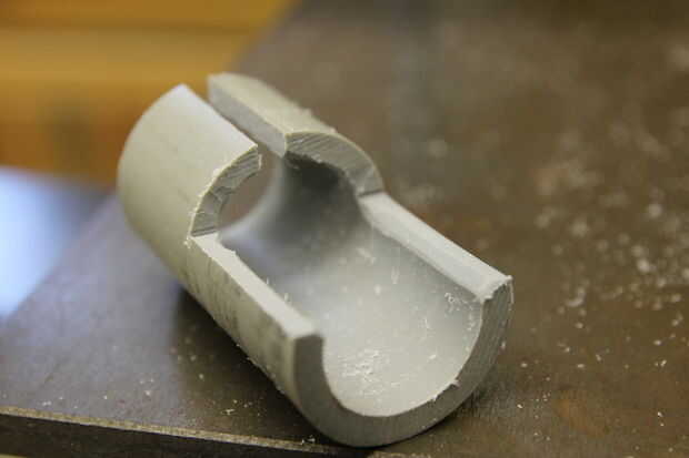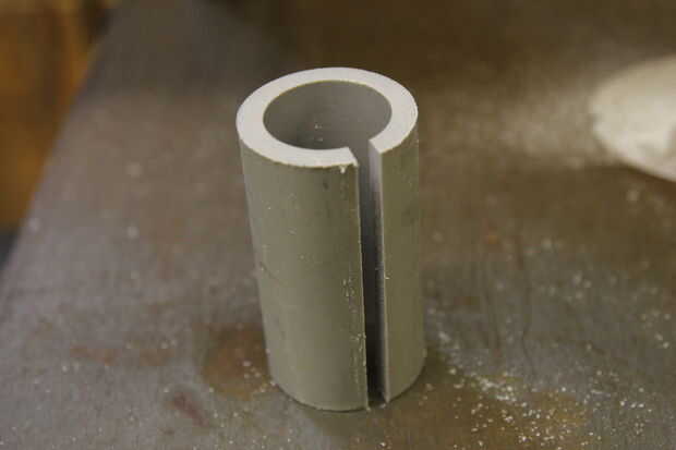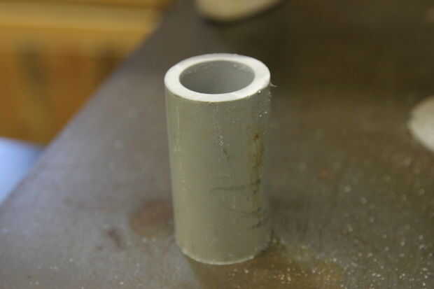 Encontré un pedazo de PVC gris que fue casi el diámetro interior para sujetar los pies mientras les perforé, pero porque era un poco demasiado apretado, cortar una hendidura en el lado que le permita ampliar un poco. A continuación corte 1/4 del tubo para que las piernas pudieran doblar hacia fuera y deje la parte inferior de la pipa sobre la mesa del taladro (ver fotos).