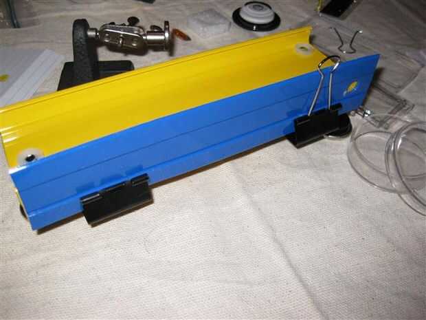 he encontrado una bonita regla goma para actuar en la indización, el flotador y base magnética. Yo utiliza tijeras del hogar para cortar la regla azul para que coincida con la longitud de la base amarilla. Usé dos clips de la carpeta de papel metal 1 pulgada para sujetar la regla. Lo bueno de la base amarilla siendo un i-beam, permite múltiples formas de montaje cosas a.