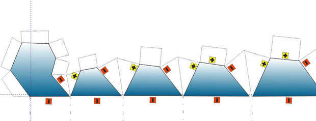 he usado una pistola de pegamento mini para pegar los imanes en el papel, esto era relativamente fácil de hacer. La parte más importante es garantizar que pega a los imanes en con la polaridad correcta (el polo real no importa, solo ser consistente). Ver el patrón básico a continuación. Empecé a pegar el imán en la ficha, añadiendo un poco de pegamento en la parte posterior de la distorsión trapezoidal y doblando el imán sobre él. Ver el video en el paso 1. En algunos casos pegan los imanes para sujetar los pliegues en su lugar, de lo contrario no eran necesarios.