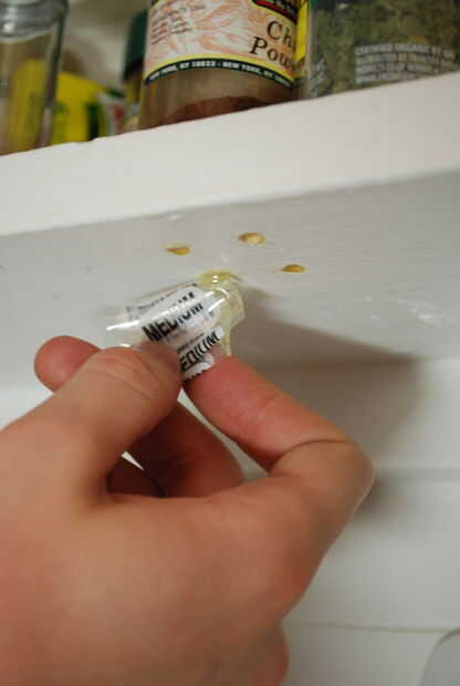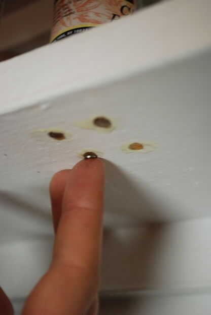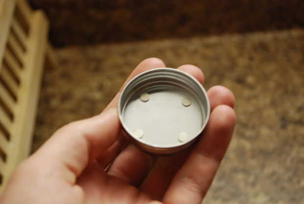 Frotis de epoxy en los agujeros, lo suficiente como para que haya una base. Dejar que el epoxi para aproximadamente un minuto y luego empuje los imanes en el epoxi con el fin de ponerlos. Asegúrese de colocar los imanes en los agujeros que se adhieren a los imanes de la tapa de los tarros, si no, sus imanes no se adhieren (rechazarán, en realidad!). Luego, aplicar epoxy sobre los imanes para sellar en los agujeros.