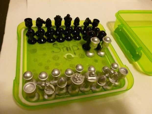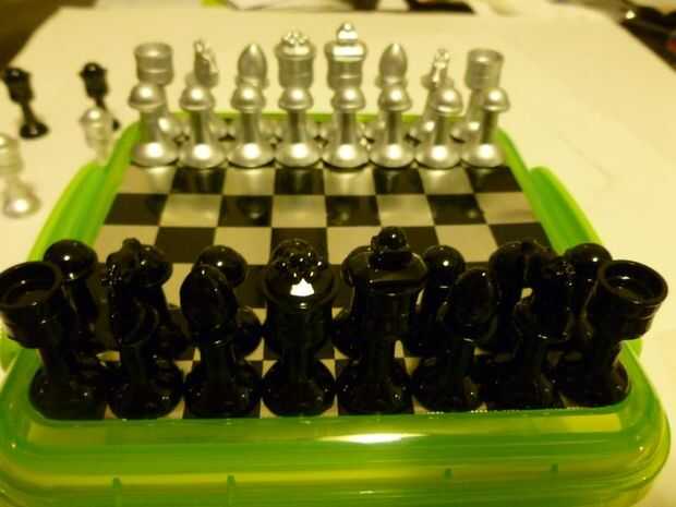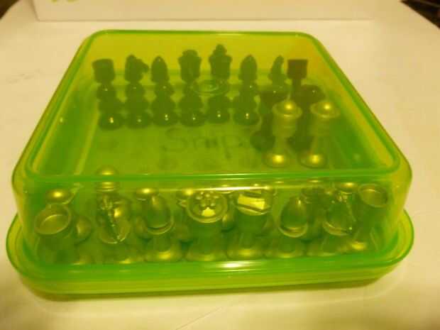 Después de unos días de secado el ajedrez juego está listo para jugar con.  Los imanes mantienen a los hombres bastante bien y el envase funciona excelentemente para contener las "piezas" cuando no esté en uso.  Los hombres colocar de pie sobre la tapa invertida que hace uso de su magnetismo y sostiene firmemente mientras no está en uso.