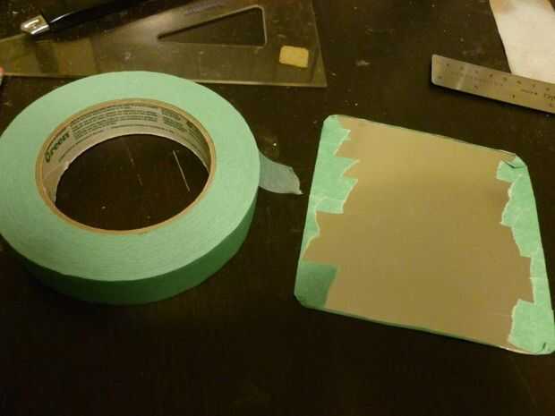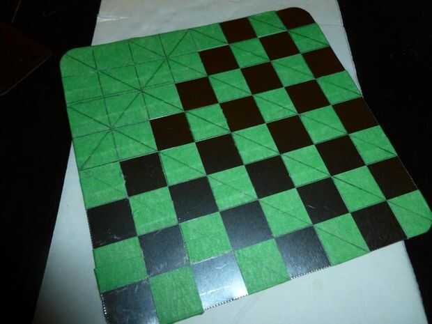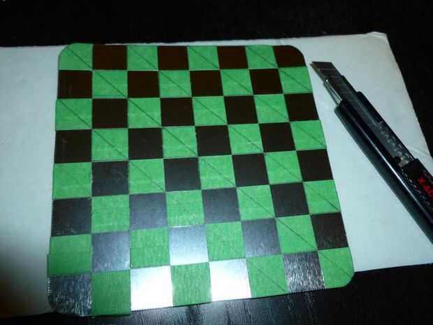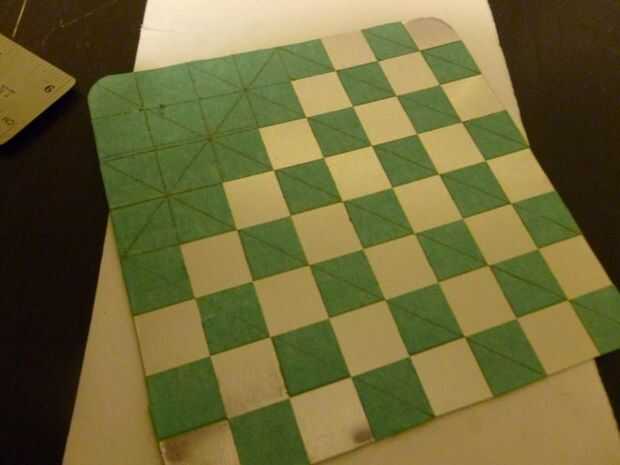 Cubrí el hueco con el pintor verde de cinta (adhesiva) y divide la superficie uniformemente en las 64 casillas que conforman la superficie de un tablero de ajedrez. Luego corte a lo largo de las divisiones con un cuchillo afilado y quitar las plazas que serían pintadas de negras. Había decidido hacer los colores de mi tablero negro y plata y puesto que la bandeja era ya un color plata me salvó tener que enmascarar y pintar el tablero dos veces (una para la pintura negra y otra de pintura blanca).