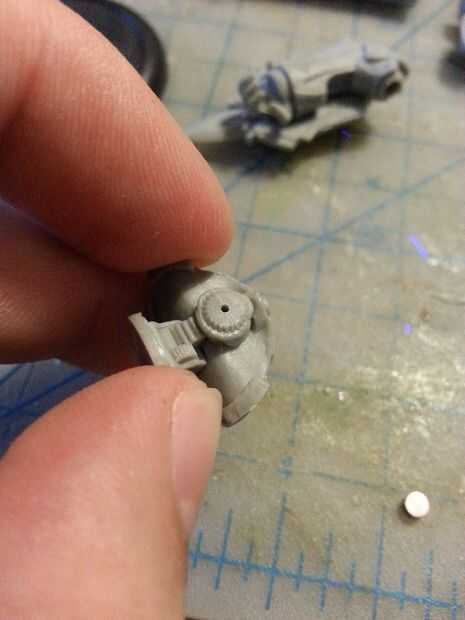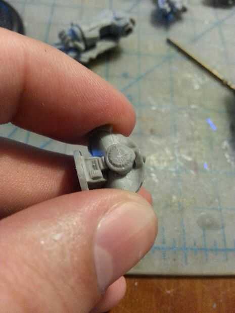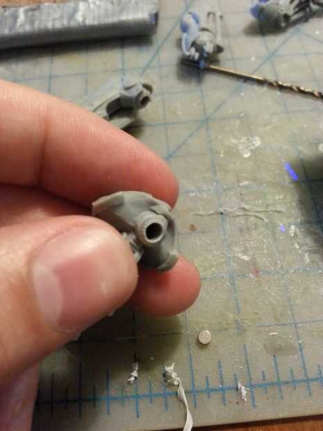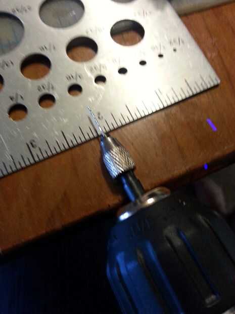 Tengo un pequeño mandril para brocas de pequeño que se supone que entra un destornillador cambiable. Esta es mi herramienta más potente para trabajar con estos modelos pequeños. En este caso perforé un orificio piloto en el hombro con una broca de diámetro similar a un alfiler de costura. es un agujero piloto, así que el diámetro no es realmente tan importante. Sólo tratar de conseguir lo más recto posible.