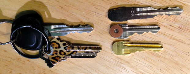 Las dos llaves son de aluminio y son fáciles de cortar y archivo, mientras que la llave del coche es de bronce y fue mucho más difícil a la forma. Utiliza tijeras para quitar la mayor parte del extremo posterior de la llave y entonces usar limas manuales para redondo y darles forma. Usé una de las arandelas 'separador' que me ayude a medir la redondez de los extremos.