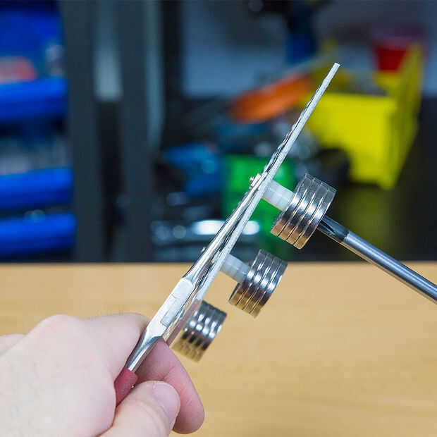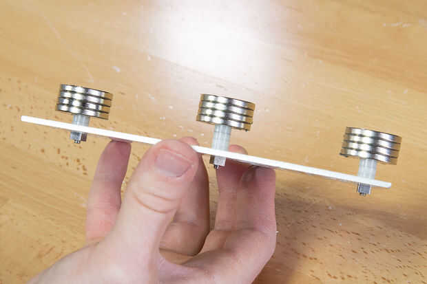 el chasis del robot. Después de algún ensayo y error, que encontramos que de los diseños hemos concebido y probado, solo tener unas cuantas pilas de imanes en el vientre del bot fue el método más confiable. Terminamos con tres pilas de cuatro imanes de diámetro 1". Cada uno es muy poderoso y tiene el poder de arruinar su día si usted no es cuidadoso. Cada imán está valorada en más de 13.200 Gauss y puede contener más de 11 libras. Así que una docena parece exageración pero queremos una distancia segura de la superficie están siendo atraídos a y necesitan sostener un objeto en movimiento a una superficie vertical. Hicimos la pila en el centro espaciada un poco más, dándole más sostener que las pilas delanteras y traseros... se trataba de hacer girar un poco más fácil, así como Asegúrese de que la parte delantera y traseras pilas no consiguieron en el camino cuando la transición desde el suelo a la pared.