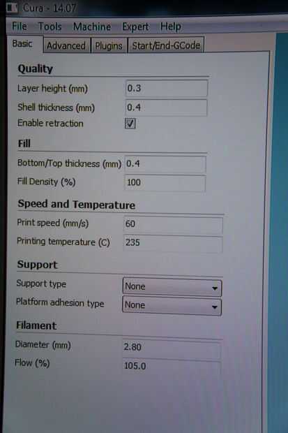 - Pla: relleno: 100% - velocidad: 50 mm/s - cáscaras: 1 (o espesor de cáscara: 0.4)-temperatura: 215 º C - Resolución: 0.2 a 0.3 (hasta usted).