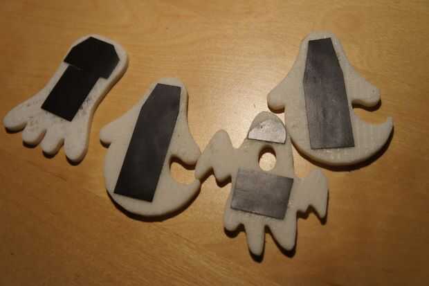 Con sus tijeras, cortar pequeñas tiras de la cinta de imán, para que ajuste a lo largo de todo el cuerpo de cada fantasma. Cinta magnética no tienen propiedades magnéticas real fuertes, así que mejor usar un poco más de cinta que no es suficiente. Como alternativa, puede utilizar pequeños imanes planos o, super pegajoso, utilizar imanes de neodimio.