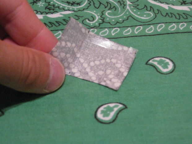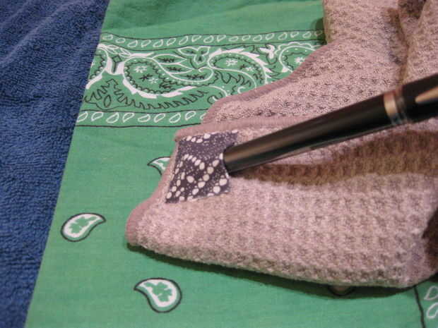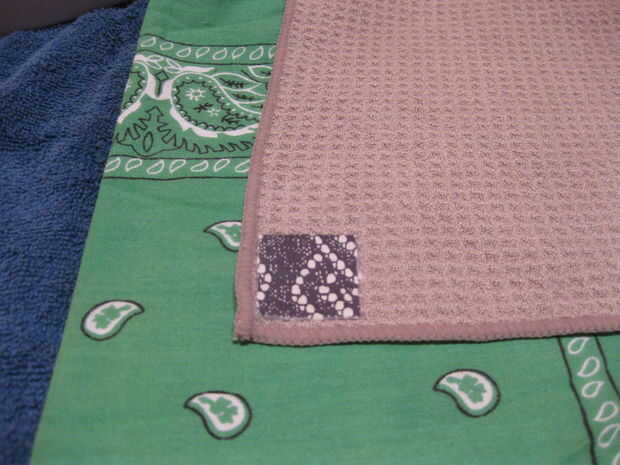 Coloque el lado adhesivo doblado imán bolsillo (tela) hacia abajo en una esquina de la toalla de cocina. El doblez debe ser hacia "en" (ver imagen).