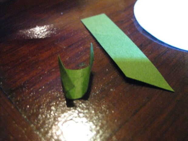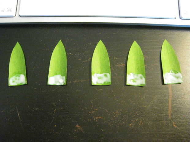 Corte algunas hojas de las flores, cinco cada uno. Hice estas hojas de una longitud estándar porque me sentía como él. Pegue un pequeño Pentágono de las hojas de la flor. Corte algunas cintas más verdes, igual a partir de los brotes. Estos conos poco facilitará la fijación de las flores a las ramas.