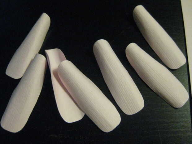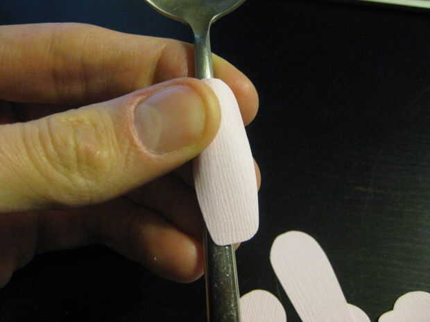 Corte un pétalo único brote y sólo llevó a cabo frente a un pétalo blanco para cortar otro. He querido nueve brotes total, que cada uno tiene tres pétalos, cortar tan 27 pétalos. Después de que yo tenía todo cortado hacia fuera que rodé los pétalos sobre una cuchara para que les de la curva un poco.