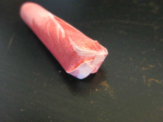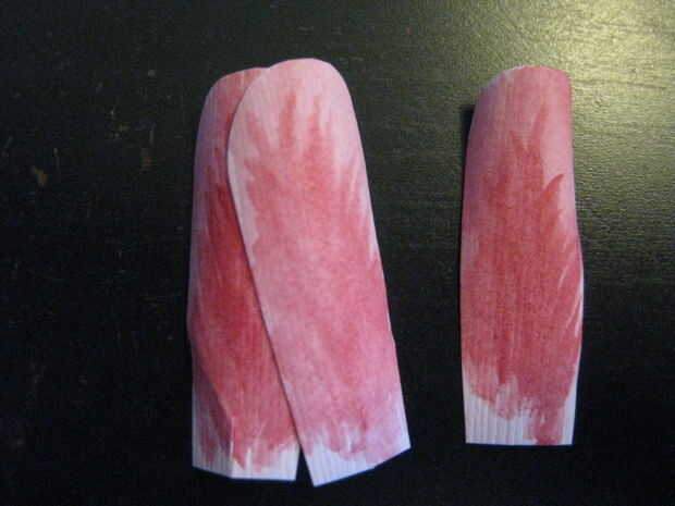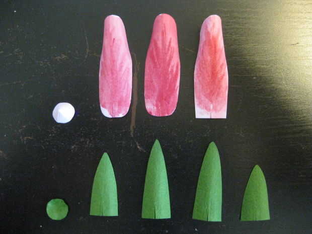 Después de pintar todos los pétalos del capullo corta 4 hojas para cada brote, yo los curvos en una cuchara, así. Hacer un cono poco superficial de papel rosa, esto irá en la punta de la yema para cerrar para arriba.