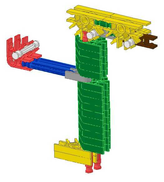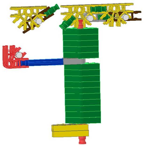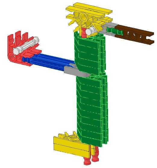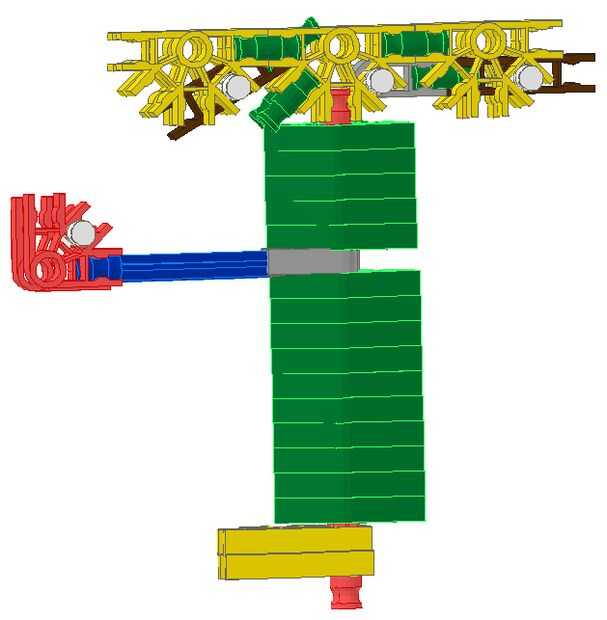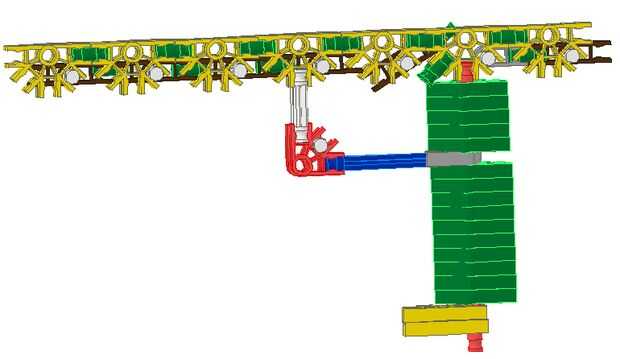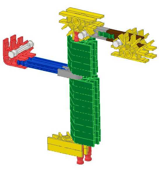 7. crear cuatro piezas más como en la imagen 4, excepto el conector marrón más cercano al girar sobre un eje conector marrón no debe tener ninguna barra verde en el lado derecho. Colocar dos barras blancas entre los conectores amarillos y rojos a cada lado.
